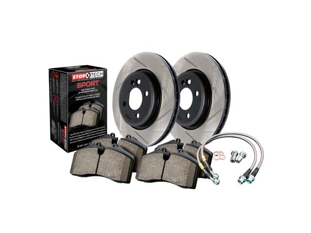 Significant brake performance improvements using the factory calipers and pre-matched; direct-replacement (OEM) sized components. This StopTech Sport Axle Pack includes Slotted StopTech Sport Rotors; StopTech Sport Pads and StopTech Stainless Steel Lines.
