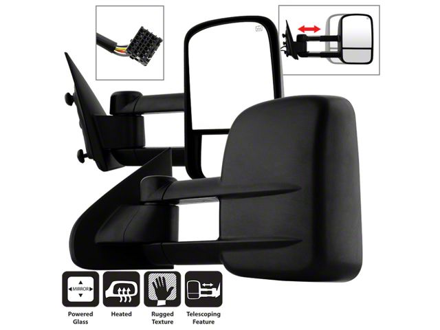 Enhance your Chevy Silverado's functionality and style with the xTune POWER Heated Telescoping Mirror Set. These mirrors are designed to provide improved visibility and convenience for daily driving, performance applications, and towing scenarios. The power-adjustable feature allows for easy positioning, while the heated functionality ensures clear visibility in cold weather conditions. The telescoping design offers additional flexibility for various driving situations.