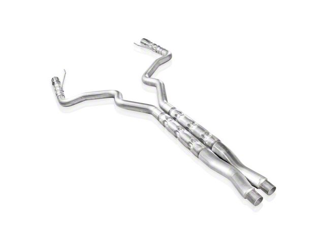 2015-16 Mustang GT 5.0L 304 stainless steel 3" catback dual-exhaust with X-pipe, retro chambered mufflers with 3" cores and mirror-polished stainless steel slash-cut conical double-wall tips. Includes hangers and clamps and is designed to mate to the factory connection point.