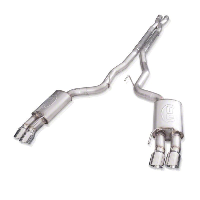2018+ Mustang GT 5.0L, 3" Catback Dual Exhaust with X-pipe. Improve sound and performance on your Mustang GT with this Redline catback exhaust from Stainless Works. Redline series, designed to get the most aggressive sound out of your GT, we've designed these mufflers to maximize the volume and tone of that 5.0L V8 while still eliminating any drone in the cabin. All tubes are CNC mandrel bent for optimal flow. Made from 304 stainless steel for maximum corrosion resistance. This is a quad tip exhaust, exiting through our 4" slash cut conical double wall polished tips Includes hangers and clamps. This system has a performance connection that mates with Stainless Works headers. This system is designed for vehicles without Active Valve Performance Exhaust. Mill finish, All TIG welded for strength and durability. These kits come with a lifetime warranty and proudly made in the USA. This system is designed for standard vehicles without the valve. Not confirmed to fit convertibles.