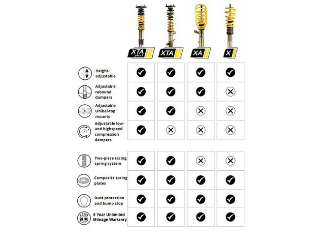For all those who want to influence more than just their ride height. ST XA Coilovers deliver the look you need through a wide range of height adjustment. With an extensively adjustable damper setup, you can precisely adjust the driving behavior of your car to achieve enhanced road control without a compromise in comfort. ST XA Coilover kits deliver precise adjustment to your ride height and look of your car. We manufacture the adjustable spring perch made of durable and friction-optimized polyamide composite material with a stainless steel insert. Thanks to the composite material corrosion is prevented between the strut and perch ensuring long lasting height adjustability while the stainless steel insert provides strength and confidence! ST XA Coilovers come preset to our factory recommended damper settings, the same configuration we test them at on our KW shock dynos before they go into your box. The 16 distinct clicks of adjustable rebound damping allow you to refine the driving dynamics with a simple turn of the adjustment knob. Each kit includes a detailed damper setup manual making it easy to reset to our recommended setting at any time. Whether your preference is comfort, sportiness, or something in between; ST XA puts the finer details of the driving dynamics in your hands. Galvanized zinc coated steel struts optimize corrosion protection for long lasting use. We add a dust protection system to prevent unwanted dirt and particulate from coming in contact with the hardened chrome piston rod or getting into the valve packs. We reinforce the system with a multi-layered pressure resistant sealing package, mono block guide system and a low friction piston band which works inside the pressure resistant internal damper housing.
