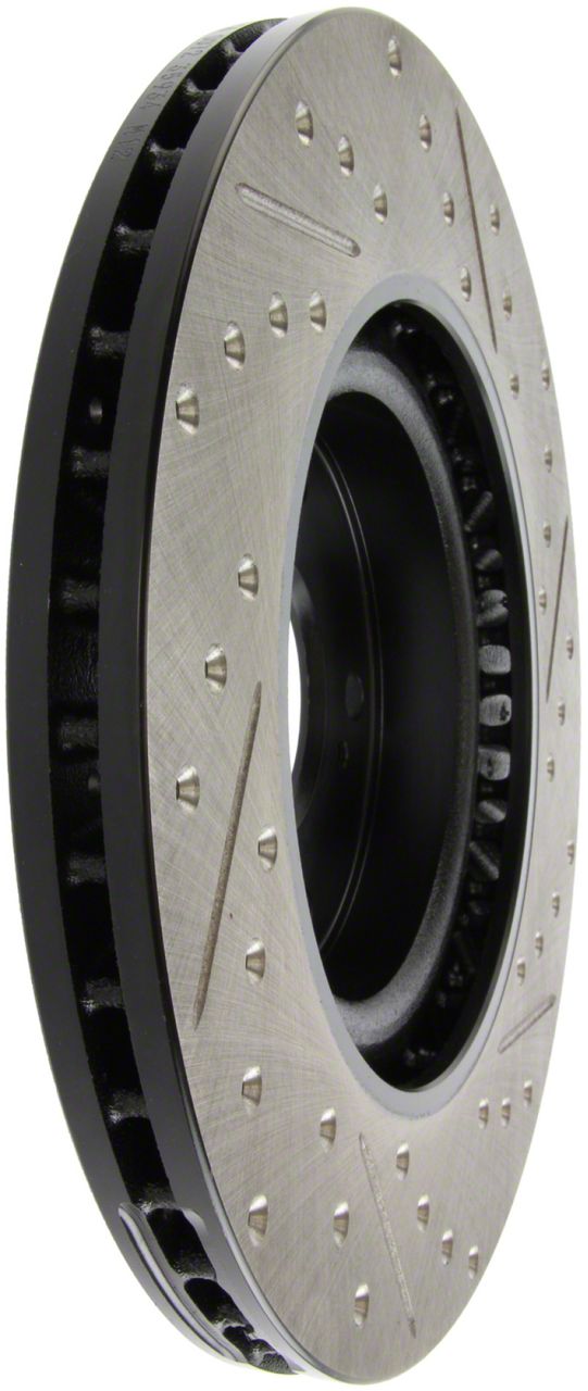 StopTech Drilled and Slotted Sport Rotors are 1-piece direct replacement brake discs for factory brake systems and stock calipers that look great behind your wheels and offer significantly improved braking performance. The unique cross-drilling and slotting aids with heat and brake dust dispersal; prevents glazing of the pads; adds bite and improves wet and dry braking performance. Built to last; the black e-coating provides protection from corrosion and the high carbon metallurgy (in most applications) offers quieter operation; better crack resistance and increased performance.
