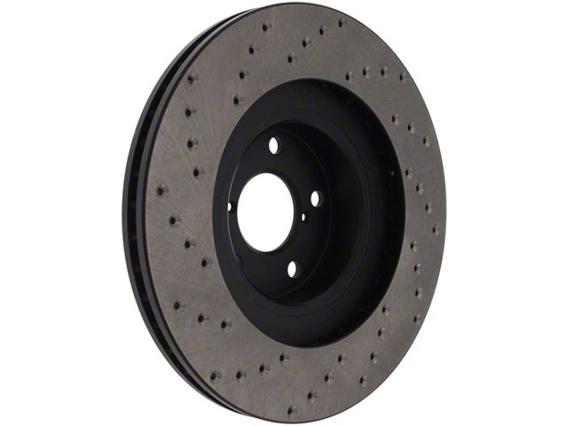 StopTech Drilled Sport Rotors are 1-piece direct replacement brake discs for factory brake systems and stock calipers that look great behind your wheels and offer significantly improved braking performance. The unique cross-drilling aids with heat and brake dust dispersal; prevents glazing of the pads; adds bite and improves wet and dry braking performance. Built to last; the black e-coating provides protection from corrosion and the high carbon metallurgy (in most applications) offers quieter operation; better crack resistance and increased performance.