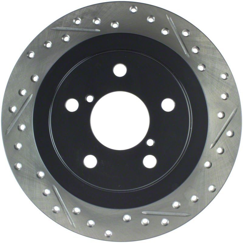 StopTech Drilled and Slotted Sport Rotors are 1-piece direct replacement brake discs for factory brake systems and stock calipers that look great behind your wheels and offer significantly improved braking performance. The unique cross-drilling and slotting aids with heat and brake dust dispersal, prevents glazing of the pads, adds bite and improves wet and dry braking performance. Built to last, the black e-coating provides protection from corrosion and the high carbon metallurgy (in most applications) offers quieter operation, better crack resistance and increased performance.
