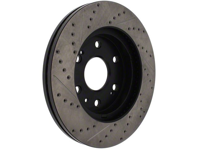 StopTech Drilled and Slotted Sport Rotors are 1-piece direct replacement brake discs for factory brake systems and stock calipers that look great behind your wheels and offer significantly improved braking performance. The unique cross-drilling and slotting aids with heat and brake dust dispersal; prevents glazing of the pads; adds bite and improves wet and dry braking performance. Built to last; the black e-coating provides protection from corrosion and the high carbon metallurgy (in most applications) offers quieter operation; better crack resistance and increased performance.