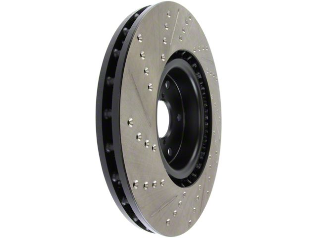 StopTech Drilled and Slotted Sport Rotors are 1-piece direct replacement brake discs for factory brake systems and stock calipers that look great behind your wheels and offer significantly improved braking performance. The unique cross-drilling and slotting aids with heat and brake dust dispersal; prevents glazing of the pads; adds bite and improves wet and dry braking performance. Built to last; the black e-coating provides protection from corrosion and the high carbon metallurgy (in most applications) offers quieter operation; better crack resistance and increased performance.