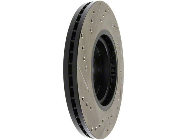 StopTech Drilled and Slotted Sport Rotors are 1-piece direct replacement brake discs for factory brake systems and stock calipers that look great behind your wheels and offer significantly improved braking performance. The unique cross-drilling and slotting aids with heat and brake dust dispersal; prevents glazing of the pads; adds bite and improves wet and dry braking performance. Built to last; the black e-coating provides protection from corrosion and the high carbon metallurgy (in most applications) offers quieter operation; better crack resistance and increased performance.