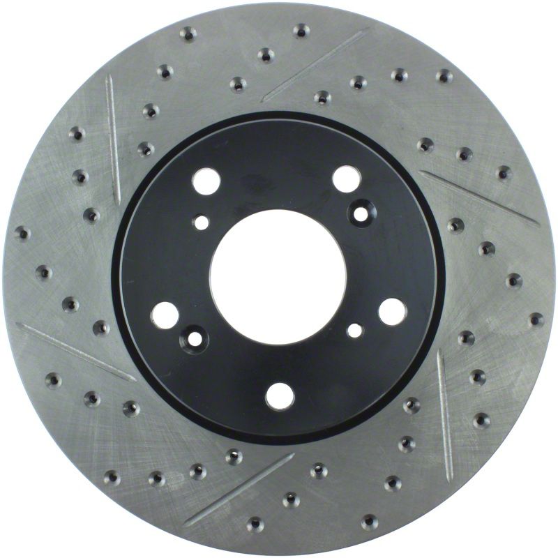 StopTech Drilled and Slotted Sport Rotors are 1-piece direct replacement brake discs for factory brake systems and stock calipers that look great behind your wheels and offer significantly improved braking performance. The unique cross-drilling and slotting aids with heat and brake dust dispersal; prevents glazing of the pads; adds bite and improves wet and dry braking performance. Built to last; the black e-coating provides protection from corrosion and the high carbon metallurgy (in most applications) offers quieter operation; better crack resistance and increased performance.