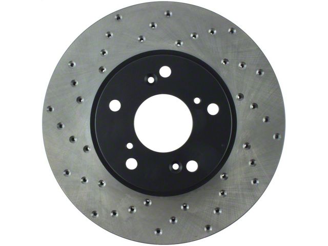 StopTech Drilled Sport Rotors are 1-piece direct replacement brake discs for factory brake systems and stock calipers that look great behind your wheels and offer significantly improved braking performance. The unique cross-drilling aids with heat and brake dust dispersal, prevents glazing of the pads, adds bite and improves wet and dry braking performance. Built to last, the black e-coating provides protection from corrosion and the high carbon metallurgy (in most applications) offers quieter operation, better crack resistance and increased performance.