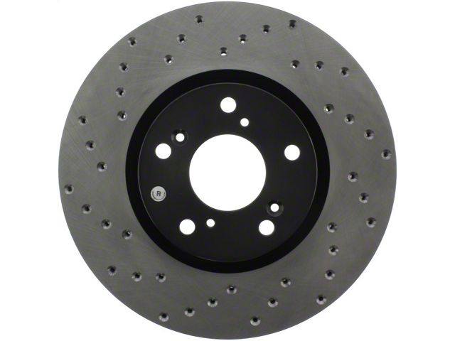 StopTech Drilled Sport Rotors are 1-piece direct replacement brake discs for factory brake systems and stock calipers that look great behind your wheels and offer significantly improved braking performance. The unique cross-drilling aids with heat and brake dust dispersal; prevents glazing of the pads; adds bite and improves wet and dry braking performance. Built to last; the black e-coating provides protection from corrosion and the high carbon metallurgy (in most applications) offers quieter operation; better crack resistance and increased performance.