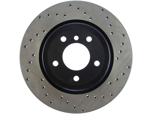 StopTech Drilled Sport Rotors are 1-piece direct replacement brake discs for factory brake systems and stock calipers that look great behind your wheels and offer significantly improved braking performance. The unique cross-drilling aids with heat and brake dust dispersal; prevents glazing of the pads; adds bite and improves wet and dry braking performance. Built to last; the black e-coating provides protection from corrosion and the high carbon metallurgy (in most applications) offers quieter operation; better crack resistance and increased performance.