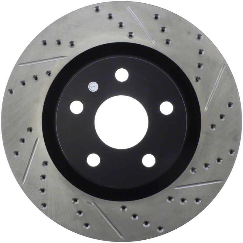 StopTech Drilled and Slotted Sport Rotors are 1-piece direct replacement brake discs for factory brake systems and stock calipers that look great behind your wheels and offer significantly improved braking performance. The unique cross-drilling and slotting aids with heat and brake dust dispersal, prevents glazing of the pads, adds bite and improves wet and dry braking performance. Built to last, the black e-coating provides protection from corrosion and the high carbon metallurgy (in most applications) offers quieter operation, better crack resistance and increased performance.