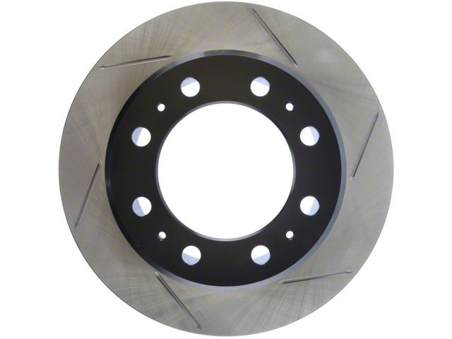StopTech Slotted Sport Rotors are 1-piece direct replacement brake discs for factory brake systems and stock calipers that look great behind your wheels and offer significantly improved braking performance. The unique slotting aids with heat and brake dust dispersal; prevents glazing of the pads; adds bite and improves wet and dry braking performance. Built to last; the black e-coating provides protection from corrosion and the high carbon metallurgy (in most applications) offers quieter operation; better crack resistance and increased performance.