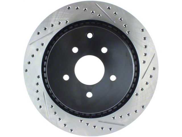StopTech Drilled and Slotted Sport Rotors are 1-piece direct replacement brake discs for factory brake systems and stock calipers that look great behind your wheels and offer significantly improved braking performance. The unique cross-drilling and slotting aids with heat and brake dust dispersal; prevents glazing of the pads; adds bite and improves wet and dry braking performance. Built to last; the black e-coating provides protection from corrosion and the high carbon metallurgy (in most applications) offers quieter operation; better crack resistance and increased performance.