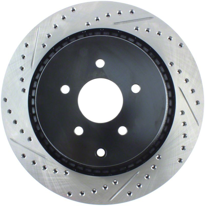 StopTech Drilled and Slotted Sport Rotors are 1-piece direct replacement brake discs for factory brake systems and stock calipers that look great behind your wheels and offer significantly improved braking performance. The unique cross-drilling and slotting aids with heat and brake dust dispersal; prevents glazing of the pads; adds bite and improves wet and dry braking performance. Built to last; the black e-coating provides protection from corrosion and the high carbon metallurgy (in most applications) offers quieter operation; better crack resistance and increased performance.