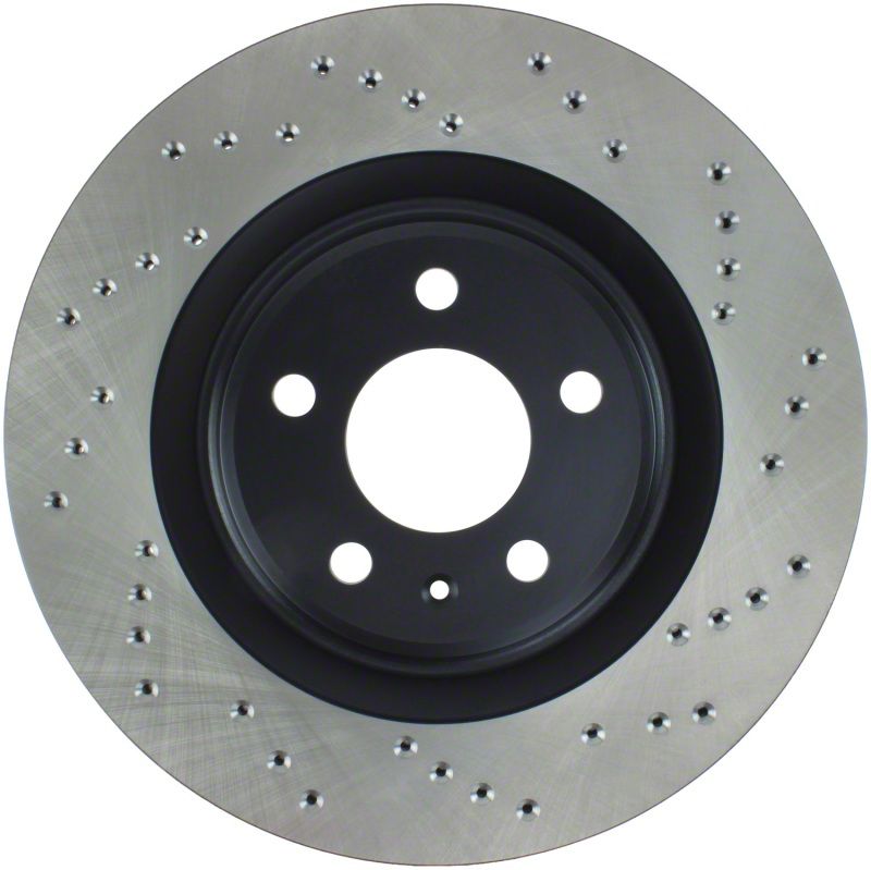 StopTech Drilled Sport Rotors are 1-piece direct replacement brake discs for factory brake systems and stock calipers that look great behind your wheels and offer significantly improved braking performance. The unique cross-drilling aids with heat and brake dust dispersal; prevents glazing of the pads; adds bite and improves wet and dry braking performance. Built to last; the black e-coating provides protection from corrosion and the high carbon metallurgy (in most applications) offers quieter operation; better crack resistance and increased performance.