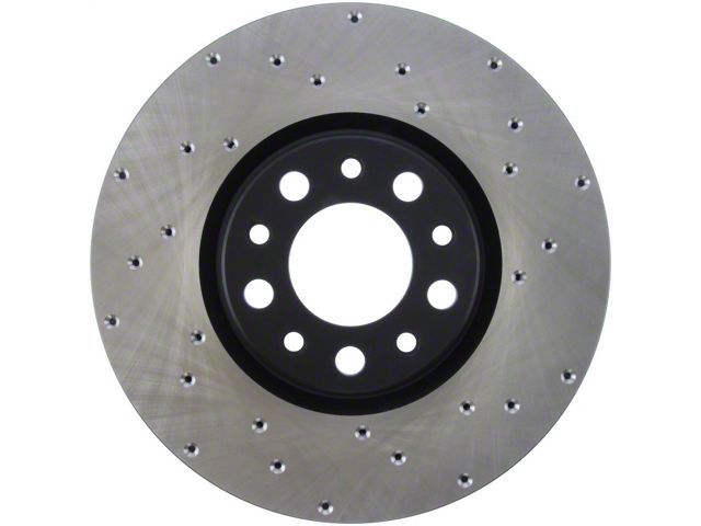 StopTech Drilled Sport Rotors are 1-piece direct replacement brake discs for factory brake systems and stock calipers that look great behind your wheels and offer significantly improved braking performance. The unique cross-drilling aids with heat and brake dust dispersal, prevents glazing of the pads, adds bite and improves wet and dry braking performance. Built to last, the black e-coating provides protection from corrosion and the high carbon metallurgy (in most applications) offers quieter operation, better crack resistance and increased performance.