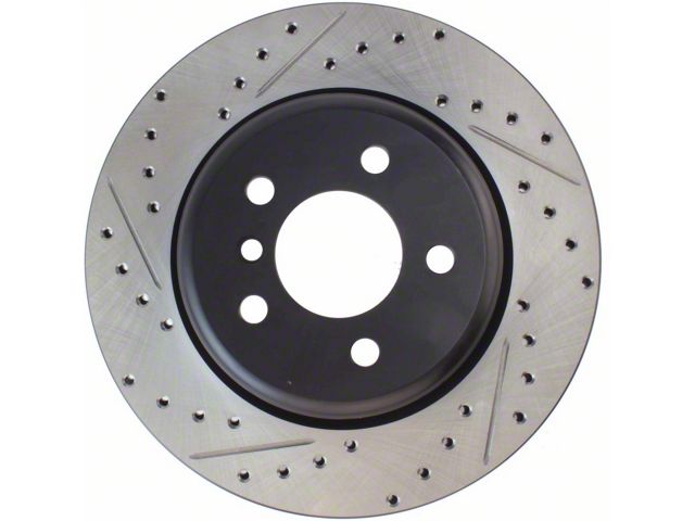 StopTech Drilled and Slotted Sport Rotors are 1-piece direct replacement brake discs for factory brake systems and stock calipers that look great behind your wheels and offer significantly improved braking performance. The unique cross-drilling and slotting aids with heat and brake dust dispersal; prevents glazing of the pads; adds bite and improves wet and dry braking performance. Built to last; the black e-coating provides protection from corrosion and the high carbon metallurgy (in most applications) offers quieter operation; better crack resistance and increased performance.