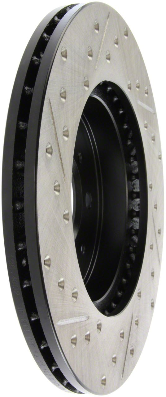 StopTech Drilled and Slotted Sport Rotors are 1-piece direct replacement brake discs for factory brake systems and stock calipers that look great behind your wheels and offer significantly improved braking performance. The unique cross-drilling and slotting aids with heat and brake dust dispersal; prevents glazing of the pads; adds bite and improves wet and dry braking performance. Built to last; the black e-coating provides protection from corrosion and the high carbon metallurgy (in most applications) offers quieter operation; better crack resistance and increased performance.