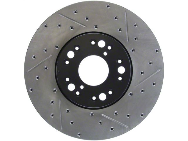 StopTech Drilled and Slotted Sport Rotors are 1-piece direct replacement brake discs for factory brake systems and stock calipers that look great behind your wheels and offer significantly improved braking performance. The unique cross-drilling and slotting aids with heat and brake dust dispersal; prevents glazing of the pads; adds bite and improves wet and dry braking performance. Built to last; the black e-coating provides protection from corrosion and the high carbon metallurgy (in most applications) offers quieter operation; better crack resistance and increased performance.