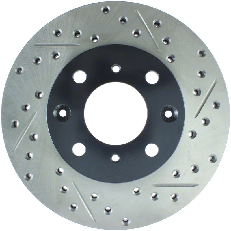 StopTech Drilled and Slotted Sport Rotors are 1-piece direct replacement brake discs for factory brake systems and stock calipers that look great behind your wheels and offer significantly improved braking performance. The unique cross-drilling and slotting aids with heat and brake dust dispersal; prevents glazing of the pads; adds bite and improves wet and dry braking performance. Built to last; the black e-coating provides protection from corrosion and the high carbon metallurgy (in most applications) offers quieter operation; better crack resistance and increased performance.