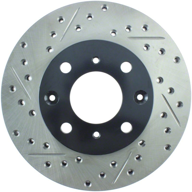 StopTech Drilled and Slotted Sport Rotors are 1-piece direct replacement brake discs for factory brake systems and stock calipers that look great behind your wheels and offer significantly improved braking performance. The unique cross-drilling and slotting aids with heat and brake dust dispersal; prevents glazing of the pads; adds bite and improves wet and dry braking performance. Built to last; the black e-coating provides protection from corrosion and the high carbon metallurgy (in most applications) offers quieter operation; better crack resistance and increased performance.
