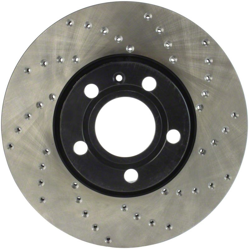 StopTech Drilled Sport Rotors are 1-piece direct replacement brake discs for factory brake systems and stock calipers that look great behind your wheels – and offer significantly improved braking performance. The unique cross-drilling aids with heat and brake dust dispersal, prevents glazing of the pads, adds bite and improves wet and dry braking performance. Built to last, the black e-coating provides protection from corrosion and the high carbon metallurgy (in most applications) offers quieter operation, better crack resistance and increased performance.