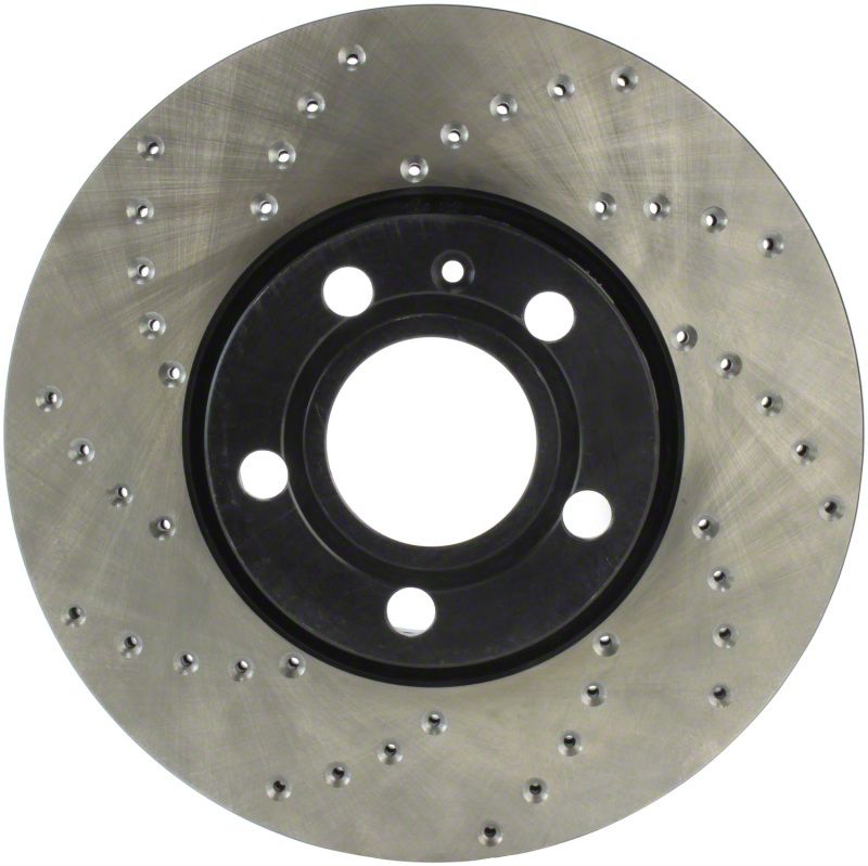 StopTech Drilled Sport Rotors are 1-piece direct replacement brake discs for factory brake systems and stock calipers that look great behind your wheels and offer significantly improved braking performance. The unique cross-drilling aids with heat and brake dust dispersal, prevents glazing of the pads, adds bite and improves wet and dry braking performance. Built to last, the black e-coating provides protection from corrosion and the high carbon metallurgy (in most applications) offers quieter operation, better crack resistance and increased performance.