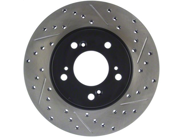 StopTech Drilled and Slotted Sport Rotors are 1-piece direct replacement brake discs for factory brake systems and stock calipers that look great behind your wheels and offer significantly improved braking performance. The unique cross-drilling and slotting aids with heat and brake dust dispersal; prevents glazing of the pads; adds bite and improves wet and dry braking performance. Built to last; the black e-coating provides protection from corrosion and the high carbon metallurgy (in most applications) offers quieter operation; better crack resistance and increased performance.
