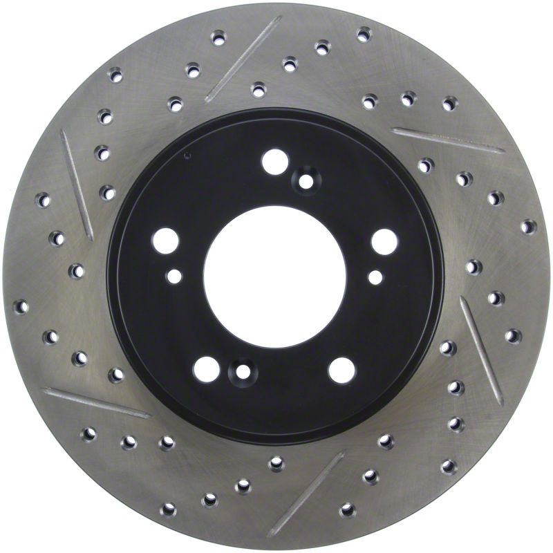 StopTech Drilled and Slotted Sport Rotors are 1-piece direct replacement brake discs for factory brake systems and stock calipers that look great behind your wheels and offer significantly improved braking performance. The unique cross-drilling and slotting aids with heat and brake dust dispersal; prevents glazing of the pads; adds bite and improves wet and dry braking performance. Built to last; the black e-coating provides protection from corrosion and the high carbon metallurgy (in most applications) offers quieter operation; better crack resistance and increased performance.