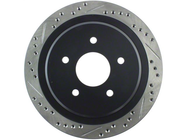 StopTech Drilled and Slotted Sport Rotors are 1-piece direct replacement brake discs for factory brake systems and stock calipers that look great behind your wheels and offer significantly improved braking performance. The unique cross-drilling and slotting aids with heat and brake dust dispersal; prevents glazing of the pads; adds bite and improves wet and dry braking performance. Built to last; the black e-coating provides protection from corrosion and the high carbon metallurgy (in most applications) offers quieter operation; better crack resistance and increased performance.