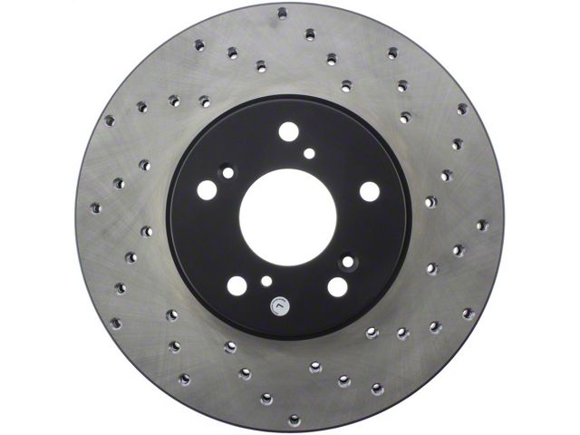 StopTech Drilled Sport Rotors are 1-piece direct replacement brake discs for factory brake systems and stock calipers that look great behind your wheels and offer significantly improved braking performance. The unique cross-drilling aids with heat and brake dust dispersal; prevents glazing of the pads; adds bite and improves wet and dry braking performance. Built to last; the black e-coating provides protection from corrosion and the high carbon metallurgy (in most applications) offers quieter operation; better crack resistance and increased performance.