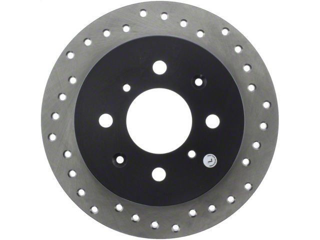 StopTech Drilled Sport Rotors are 1-piece direct replacement brake discs for factory brake systems and stock calipers that look great behind your wheels and offer significantly improved braking performance. The unique cross-drilling aids with heat and brake dust dispersal; prevents glazing of the pads; adds bite and improves wet and dry braking performance. Built to last; the black e-coating provides protection from corrosion and the high carbon metallurgy (in most applications) offers quieter operation; better crack resistance and increased performance.