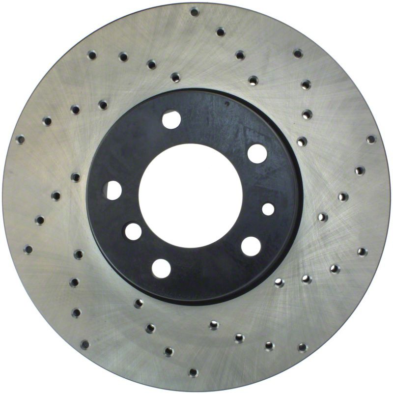 StopTech Drilled Sport Rotors are 1-piece direct replacement brake discs for factory brake systems and stock calipers that look great behind your wheels and offer significantly improved braking performance. The unique cross-drilling aids with heat and brake dust dispersal, prevents glazing of the pads, adds bite and improves wet and dry braking performance. Built to last, the black e-coating provides protection from corrosion and the high carbon metallurgy (in most applications) offers quieter operation, better crack resistance and increased performance.