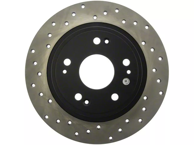 StopTech Drilled Sport Rotors are 1-piece direct replacement brake discs for factory brake systems and stock calipers that look great behind your wheels and offer significantly improved braking performance. The unique cross-drilling aids with heat and brake dust dispersal; prevents glazing of the pads; adds bite and improves wet and dry braking performance. Built to last; the black e-coating provides protection from corrosion and the high carbon metallurgy (in most applications) offers quieter operation; better crack resistance and increased performance.