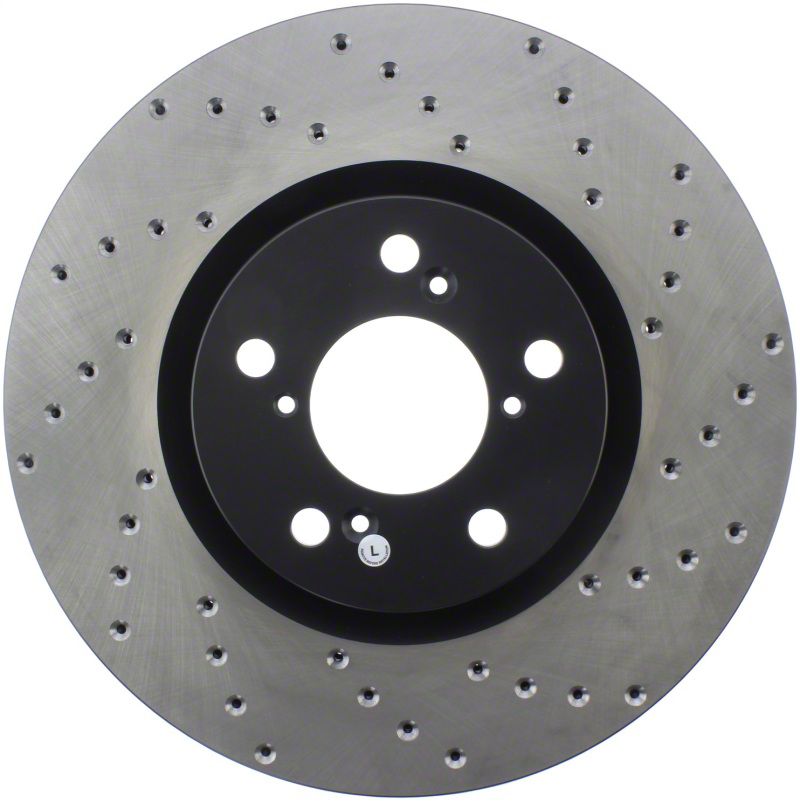 StopTech Drilled Sport Rotors are 1-piece direct replacement brake discs for factory brake systems and stock calipers that look great behind your wheels and offer significantly improved braking performance. The unique cross-drilling aids with heat and brake dust dispersal, prevents glazing of the pads, adds bite and improves wet and dry braking performance. Built to last, the black e-coating provides protection from corrosion and the high carbon metallurgy (in most applications) offers quieter operation, better crack resistance and increased performance.