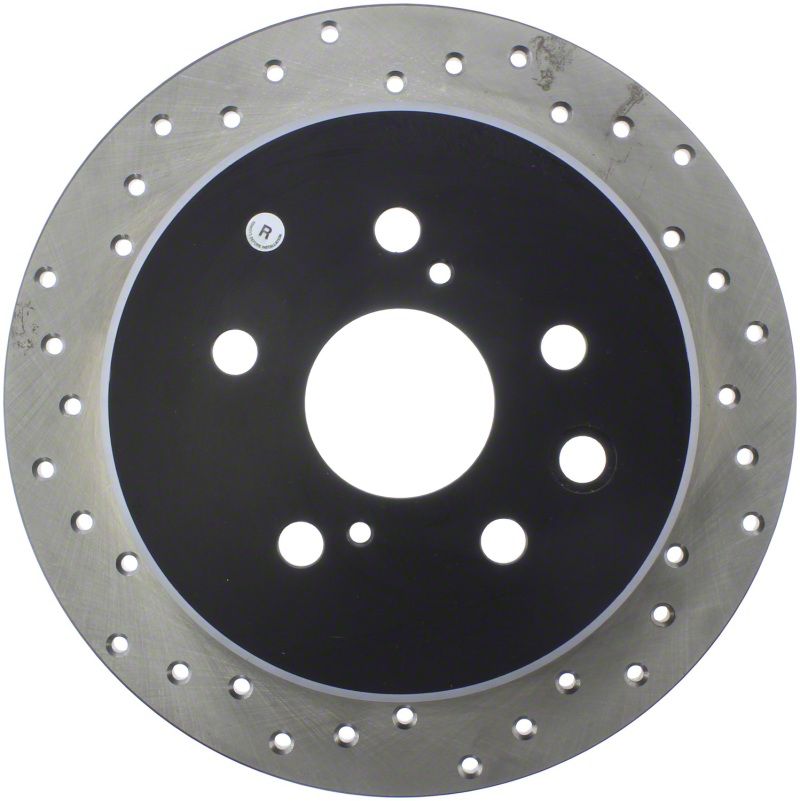StopTech Drilled Sport Rotors are 1-piece direct replacement brake discs for factory brake systems and stock calipers that look great behind your wheels and offer significantly improved braking performance. The unique cross-drilling aids with heat and brake dust dispersal, prevents glazing of the pads, adds bite and improves wet and dry braking performance. Built to last, the black e-coating provides protection from corrosion and the high carbon metallurgy (in most applications) offers quieter operation, better crack resistance and increased performance.