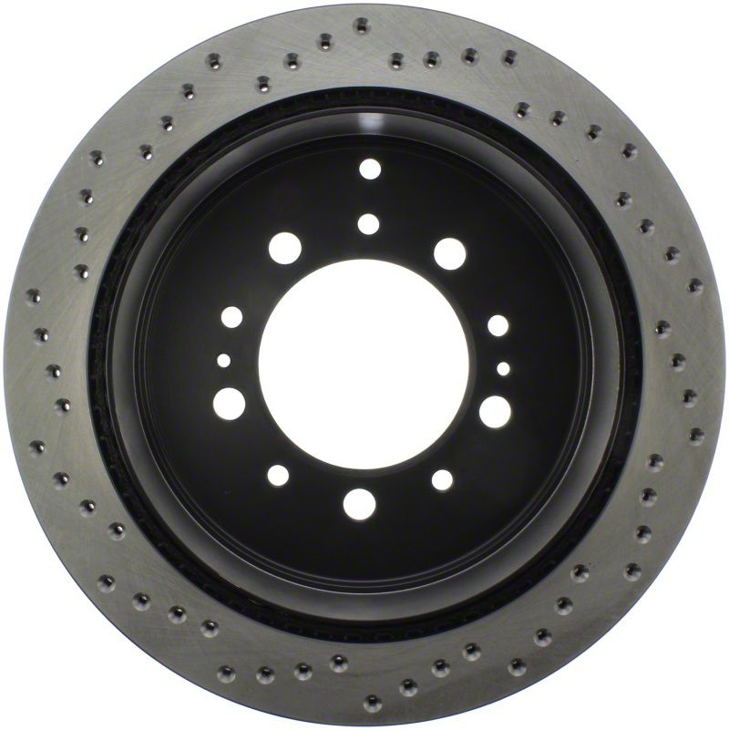 StopTech Drilled Sport Rotors are 1-piece direct replacement brake discs for factory brake systems and stock calipers that look great behind your wheels and offer significantly improved braking performance. The unique cross-drilling aids with heat and brake dust dispersal, prevents glazing of the pads, adds bite and improves wet and dry braking performance. Built to last, the black e-coating provides protection from corrosion and the high carbon metallurgy (in most applications) offers quieter operation, better crack resistance and increased performance.