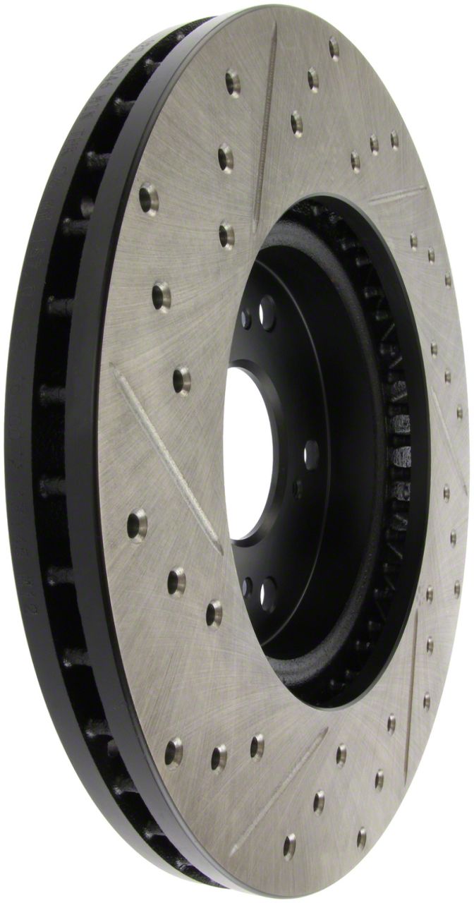 StopTech Drilled and Slotted Sport Rotors are 1-piece direct replacement brake discs for factory brake systems and stock calipers that look great behind your wheels and offer significantly improved braking performance. The unique cross-drilling and slotting aids with heat and brake dust dispersal; prevents glazing of the pads; adds bite and improves wet and dry braking performance. Built to last; the black e-coating provides protection from corrosion and the high carbon metallurgy (in most applications) offers quieter operation; better crack resistance and increased performance.