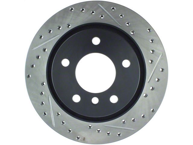 StopTech Drilled and Slotted Sport Rotors are 1-piece direct replacement brake discs for factory brake systems and stock calipers that look great behind your wheels and offer significantly improved braking performance. The unique cross-drilling and slotting aids with heat and brake dust dispersal; prevents glazing of the pads; adds bite and improves wet and dry braking performance. Built to last; the black e-coating provides protection from corrosion and the high carbon metallurgy (in most applications) offers quieter operation; better crack resistance and increased performance.