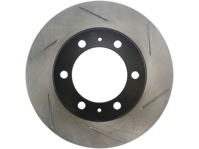 StopTech Slotted Sport Rotors are 1-piece direct replacement brake discs for factory brake systems and stock calipers that look great behind your wheels and offer significantly improved braking performance. The unique slotting aids with heat and brake dust dispersal; prevents glazing of the pads; adds bite and improves wet and dry braking performance. Built to last; the black e-coating provides protection from corrosion and the high carbon metallurgy (in most applications) offers quieter operation; better crack resistance and increased performance.