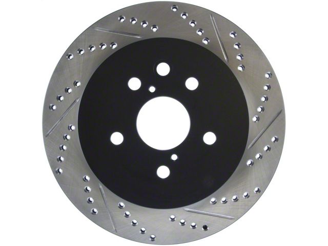 StopTech Drilled and Slotted Sport Rotors are 1-piece direct replacement brake discs for factory brake systems and stock calipers that look great behind your wheels and offer significantly improved braking performance. The unique cross-drilling and slotting aids with heat and brake dust dispersal; prevents glazing of the pads; adds bite and improves wet and dry braking performance. Built to last; the black e-coating provides protection from corrosion and the high carbon metallurgy (in most applications) offers quieter operation; better crack resistance and increased performance.