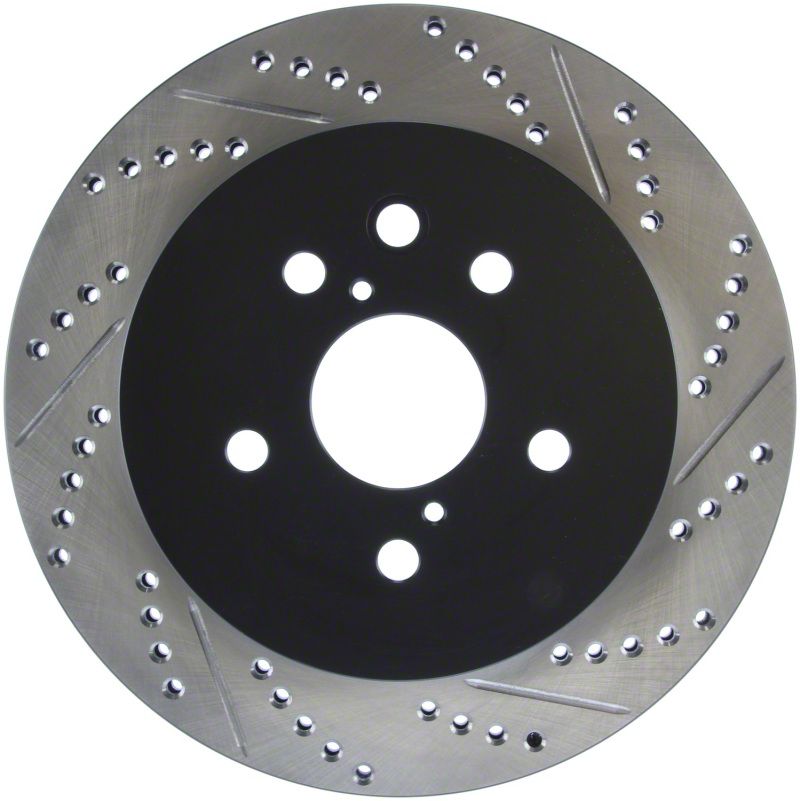 StopTech Drilled and Slotted Sport Rotors are 1-piece direct replacement brake discs for factory brake systems and stock calipers that look great behind your wheels and offer significantly improved braking performance. The unique cross-drilling and slotting aids with heat and brake dust dispersal; prevents glazing of the pads; adds bite and improves wet and dry braking performance. Built to last; the black e-coating provides protection from corrosion and the high carbon metallurgy (in most applications) offers quieter operation; better crack resistance and increased performance.
