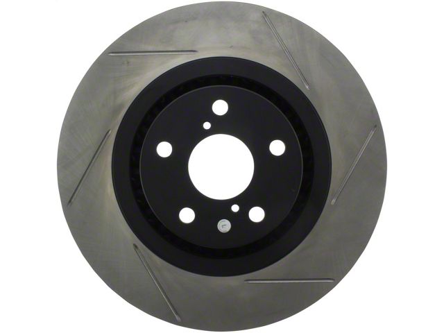 StopTech Slotted Sport Rotors are 1-piece direct replacement brake discs for factory brake systems and stock calipers that look great behind your wheels and offer significantly improved braking performance. The unique slotting aids with heat and brake dust dispersal; prevents glazing of the pads; adds bite and improves wet and dry braking performance. Built to last; the black e-coating provides protection from corrosion and the high carbon metallurgy (in most applications) offers quieter operation; better crack resistance and increased performance.