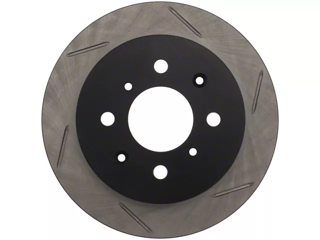 StopTech Slotted Sport Rotors are 1-piece direct replacement brake discs for factory brake systems and stock calipers that look great behind your wheels and offer significantly improved braking performance. The unique slotting aids with heat and brake dust dispersal; prevents glazing of the pads; adds bite and improves wet and dry braking performance. Built to last; the black e-coating provides protection from corrosion and the high carbon metallurgy (in most applications) offers quieter operation; better crack resistance and increased performance.