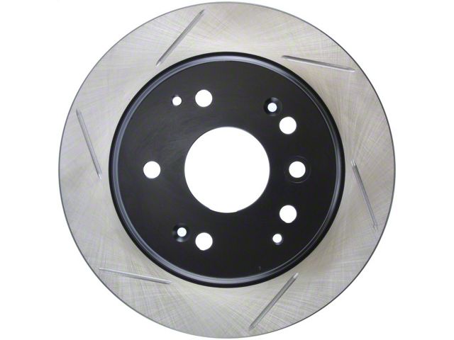 StopTech Slotted Sport Rotors are 1-piece direct replacement brake discs for factory brake systems and stock calipers that look great behind your wheels and offer significantly improved braking performance. The unique slotting aids with heat and brake dust dispersal; prevents glazing of the pads; adds bite and improves wet and dry braking performance. Built to last; the black e-coating provides protection from corrosion and the high carbon metallurgy (in most applications) offers quieter operation; better crack resistance and increased performance.