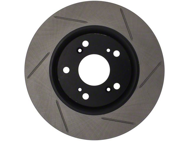 StopTech Slotted Sport Rotors are 1-piece direct replacement brake discs for factory brake systems and stock calipers that look great behind your wheels and offer significantly improved braking performance. The unique slotting aids with heat and brake dust dispersal; prevents glazing of the pads; adds bite and improves wet and dry braking performance. Built to last; the black e-coating provides protection from corrosion and the high carbon metallurgy (in most applications) offers quieter operation; better crack resistance and increased performance.