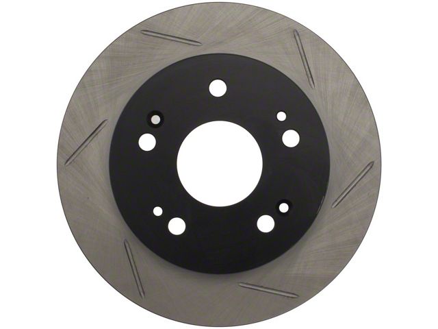 StopTech Slotted Sport Rotors are 1-piece direct replacement brake discs for factory brake systems and stock calipers that look great behind your wheels and offer significantly improved braking performance. The unique slotting aids with heat and brake dust dispersal; prevents glazing of the pads; adds bite and improves wet and dry braking performance. Built to last; the black e-coating provides protection from corrosion and the high carbon metallurgy (in most applications) offers quieter operation; better crack resistance and increased performance.