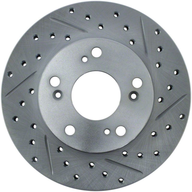 StopTech Drilled and Slotted Sport Rotors are 1-piece direct replacement brake discs for factory brake systems and stock calipers that look great behind your wheels and offer significantly improved braking performance. The unique cross-drilling and slotting aids with heat and brake dust dispersal; prevents glazing of the pads; adds bite and improves wet and dry braking performance. Built to last; the black e-coating provides protection from corrosion and the high carbon metallurgy (in most applications) offers quieter operation; better crack resistance and increased performance.