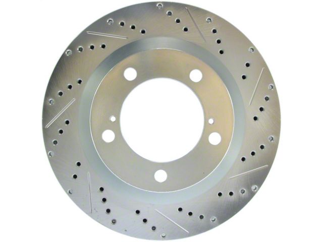 StopTech Drilled and Slotted Sport Rotors are 1-piece direct replacement brake discs for factory brake systems and stock calipers that look great behind your wheels and offer significantly improved braking performance. The unique cross-drilling and slotting aids with heat and brake dust dispersal; prevents glazing of the pads; adds bite and improves wet and dry braking performance. Built to last; the black e-coating provides protection from corrosion and the high carbon metallurgy (in most applications) offers quieter operation; better crack resistance and increased performance.